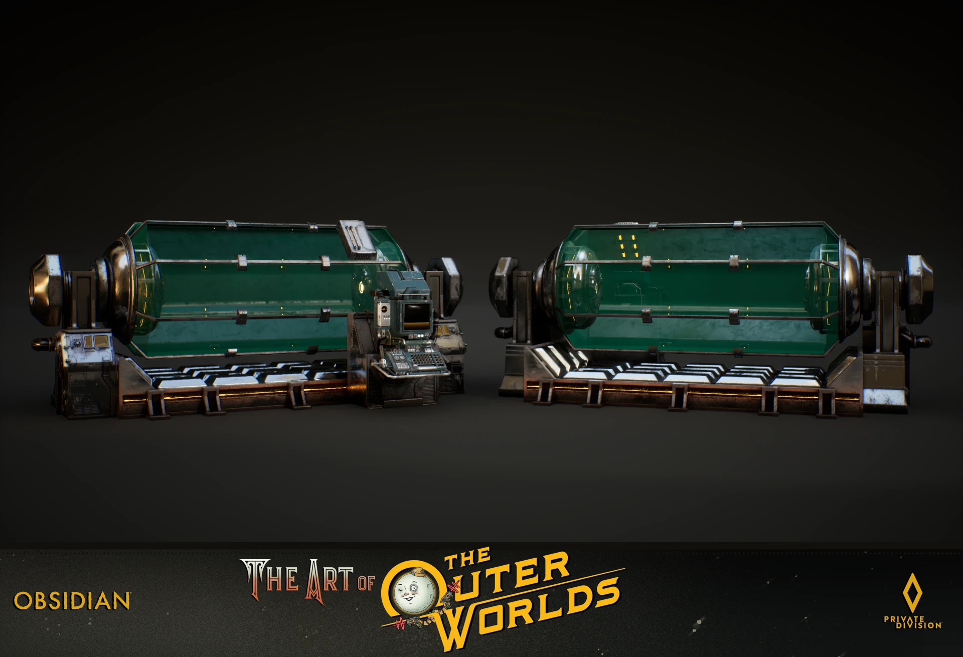 This is the laboratory experiment tank The Outer Worlds. I was responsible for the block out, high poly model, source texture baking, texturing, and shader set up on this hero prop in Unreal 5. The tank was designed modularly, as each level was designed to to be split and used independently. Many parts of this model can be spotted in various points of interest in the game and the grounded version was made to work with the main information console in game. Shots rendered in Unreal 5 and composited in Photoshop.