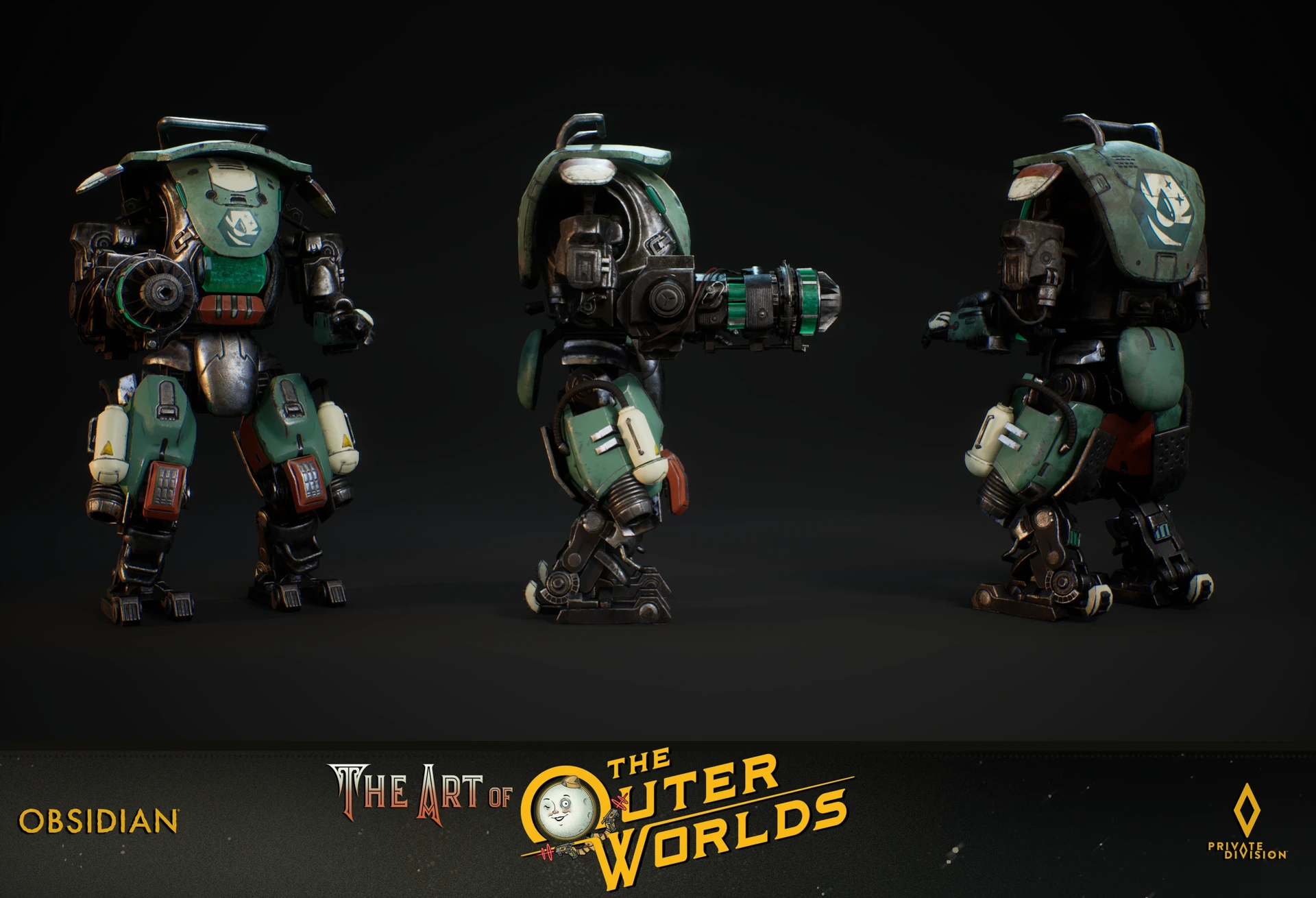 This series are the various bi-pedal auto-mechanicals from The Outer Worlds. I was responsible for the kit bashing the base model into these variants. This involved high poly model and source texture baking for variant parts such as weapons, armor and shield, as well as the texturing, and shader set up on these auto-mechanicals in Unreal 5. Shot rendered in Unreal 5 and composited in Photoshop.
